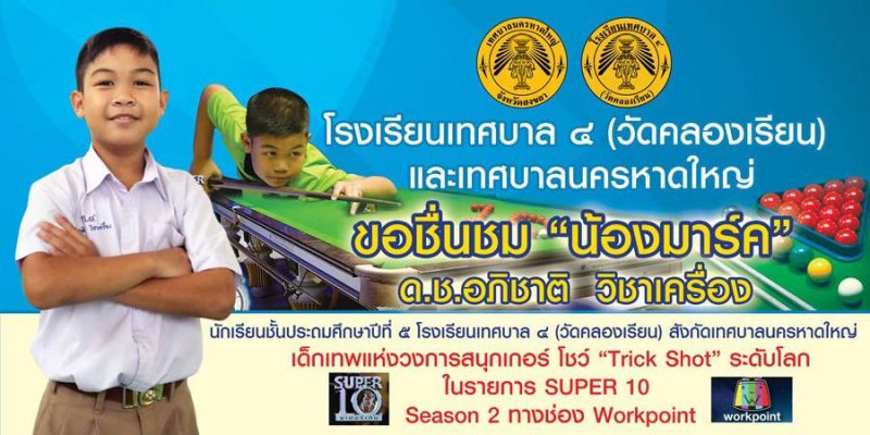 บอกได้เลยว่าน้องมาร์คสร้างชื่อเสียงให้ชาวหาดใหญ่เป็นอย่างมาก เพราะนอกจากควมเก่งด้านสนุ๊กเกอร์แล้ว ความน่ารักและความกตัญญูที่น้องมียังมากอีกด้วย โดยการแข่งขันในครั้งนี้น้องได้รับฉายาว่า เด็กเทพแห่งวงการสนุกเกอร์ “ โชว์ “Trick shot” ระดับโลก นอกจากนี้น้องยังเคยแข่งขันในรายการต่าง ๆ ในระดับภูมิภาคและคว้ารางวัลมาอย่างหลากหลาย บอกได้เลยว่าเด็กคนนี้อนาคตไกลและน่านำมาเป็นอย่างที่ดี