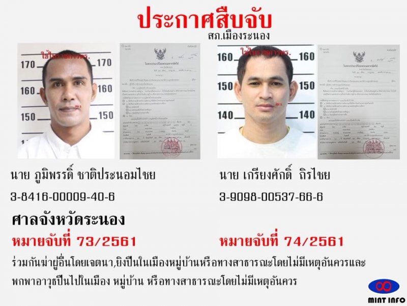 สถานีตำรวจภูธรเมืองระนอง จึงได้ประกาศจับ 2 คนร้ายโดยแจ้งข้อกล่าวหา คือ ร่วมกันฆ่าผู้อื่นโดยเจตนา ยิงปืนในหมู่บ้านหรือทางสาธารณะโดยไม่มีเหตุอันควรและพกพาอาวุธปืนไปในเมือง หมู่บ้าน หรือสาธารณะโดยไม่มีเหตุอันควร