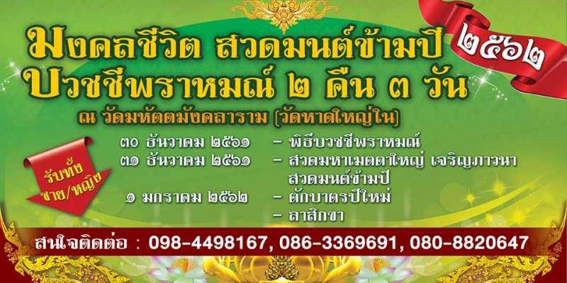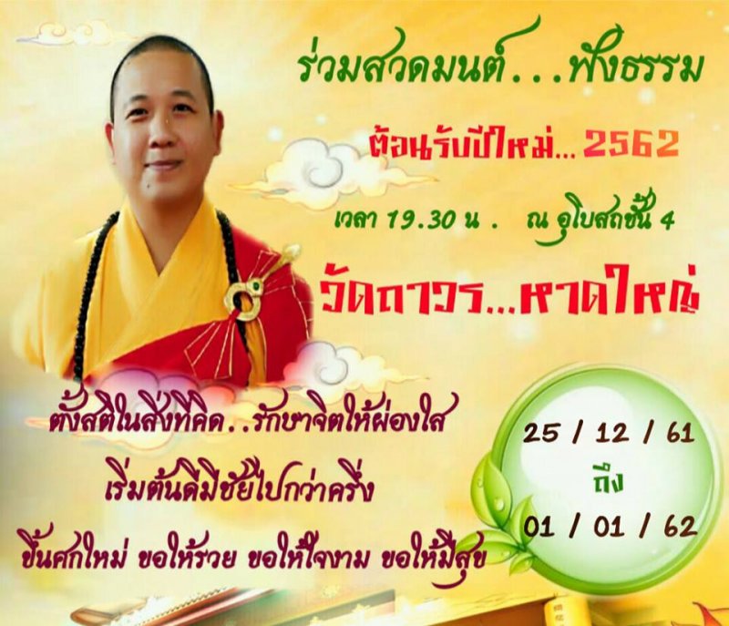 4.วัดถาวร วราราม ต้อนรับ ปี 2562 ส่งท้ายด้วยศีล ต้อนรับด้วยธรรม สวดมนต์ ข้ามปีวิถีพุทธมหายาน วัดถาวร วราราม หาดใหญ่ วันที่ 25 ธันวาคม พ.ศ. 2561 ถึง วันที่ 1 มกราคม พ.ศ. 2562