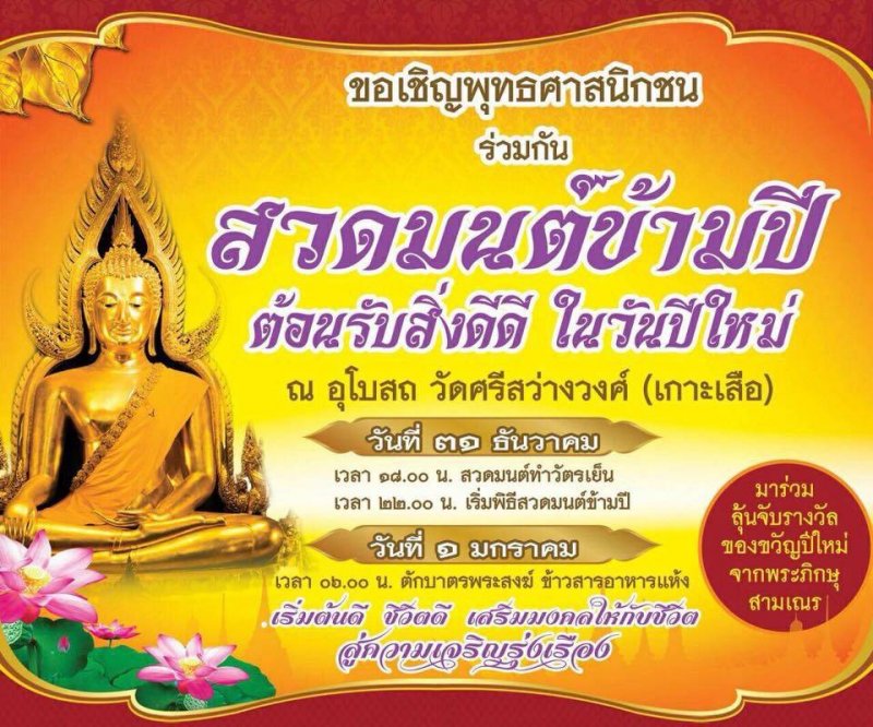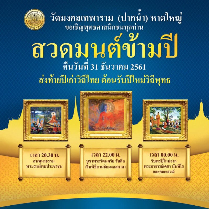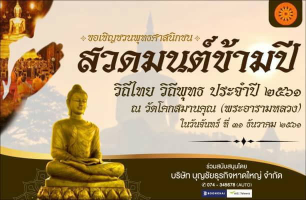 สาธยายมนต์สรรเสริญ พระพุทธเจ้า 3,000 พระองค์ เพื่อส่งท้ายปีเก่าด้วยความดีและเริ่มต้นปีใหม่ด้วยความดี ขอเชิญชวนร่วมสวดมนต์ ณ อุโบสถชั้น 4 วัดถาวรวรารามหาดใหญ่ เวลา 19.30 น