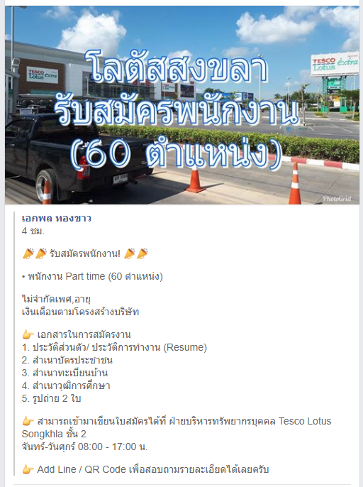 -สามารถเข้ามาเขียนใบสมัครได้ที่ ฝ่ายบริหารทรัพยากรบุคคล Tesco Lotus Songkhla ชั้น 2 จันทร์-วันศุกร์ 08:00 - 17:00 น.