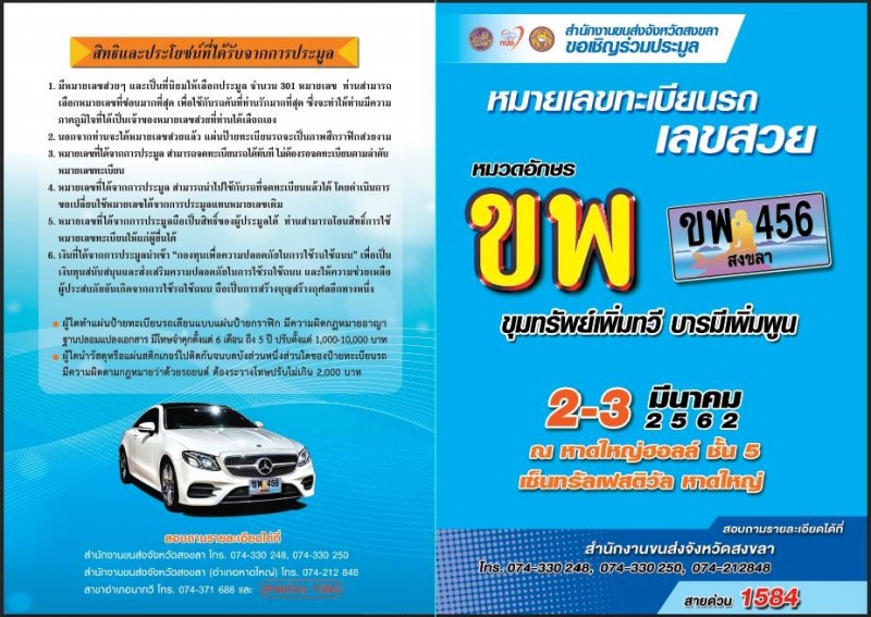 ขอเชิญร่วมประมูลทะเบียนรถเลขสวย รถยนต์ส่วนบุคคล(เก๋ง+กระบะ 4 ประตู) หมวดอักษร ขพ "ขุมทรัพย์เพิ่มทวี บารมีเพิ่มพูน" จำนวนทั้งสิ้น 301 หมายเลข โดยประมูล ณ หาดใหญ่ฮอลล์ ชั้น 5 เซ็นทรัลเฟสติวัลหาดใหญ่ ในวันที่ 2-3 มี.ค. 62