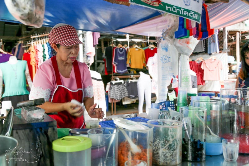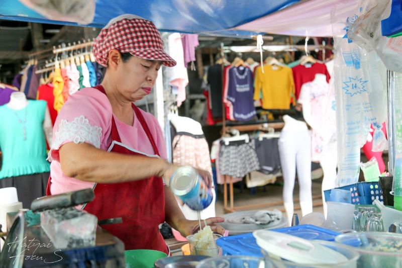 หลังจากนั้นก็ย้ายมาอยู่ที่ ควนเนียง สมัยนั้นมี เฮียเลี้ยง ขายน้ำแข็งขูด อยู่ก่อนแล้ว จึงเริ่มต้นในการคิดสูตรน้ำแข็งขูด เช่น ใส่ลอดช่องเขียว หรือการเพิ่มกลิ่นรสให้ถูกใจลูกค้า ในช่วงนั้นในควนเนียงมีอยู่ 6 เจ้าที่ขายอยู่ ตั้งกันคนละมุมในบริเวณตลาดควนเนียง ขายดีมาก จนถึงปัจจุบันก็เพิ่งเลิกขายไปเพราะหัวเข่าไม่ดี สาเหตุมาจากการยืนขูดน้ำแข็งมานานนับ 10 ปี