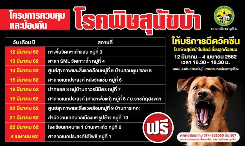 โครงการควบคุมและป้องกันโรคพิษสุนัขบ้า ให้บริการฉีดวีคซีน 12 มี.ค. - 4 เม.ย.62 ณ สถานที่ต่าง ๆ ตามแนบที่บริการใกล้บ้านท่าน ติดต่อสอบถามเพิ่มเติมได้ที่ 074-302555 ต่อ 507
