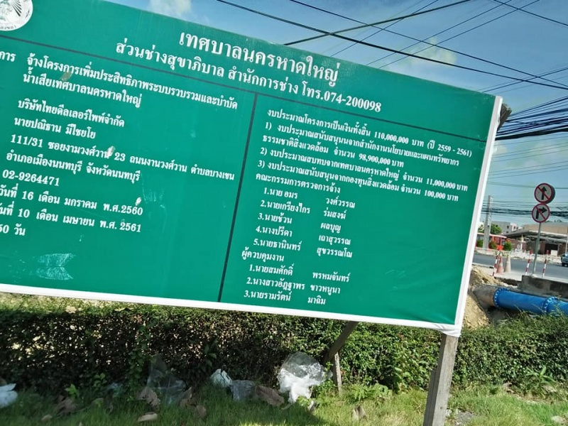 ทั้งนี้ระยะผ่านไปหลายเดือน การก่อสร้างยังไม่แล้วเสร็จและหยุดชะงักลง วันนี้ (13/3/62) เพจ สองแสน นิวส์ ได้ชี้แจงถึงกรณีดังกล่าว ว่าโครงการเพิ่มประสิทธิภาพระบบรวบรวมและบำบัดน้ำเสียเทศบาลนครหาดใหญ่ ผู้รับจ้าง บริษัทไทยดีลเลอร์ไพพ์ จำกัด ตามสัญญาเลขที่ 4/2560 ลงวันที่ 4 พฤศจิกายน 2559 เริ่มสัญญา วันที่16 มกราคม 2560 สิ้นสุดสัญญา วันที่ 10 เมษายน 2561 งบประมาณ 110,000,000 บาท เจ้าของงบประมาณ สำนักงานนโยบายและแผนทรัพยากรธรรมชาติและสิ่งแวดล้อม ขณะนี้ได้หยุดการก่อสร้างชั่วคราว เนื่องจากอยู่ระหว่างพิจารณาปรับเปลี่ยนรูปแบบการก่อสร้างเพื่อลดผลกระทบกับประชาชน โดย สำนักงานนโยบายและแผนทรัพยากรธรรมชาติและสิ่งแวดล้อม