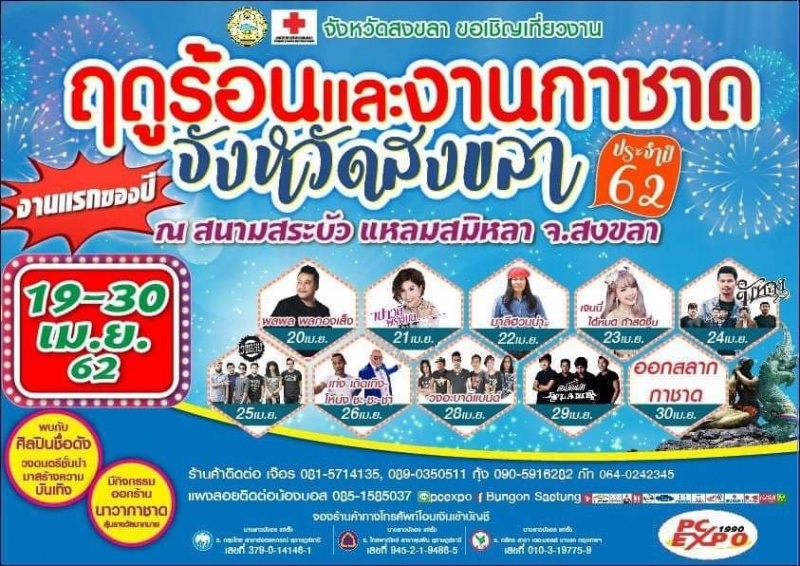 จังหวัดสงขลา ร่วมกับเหล่ากาชาดจังหวัดสงขลาขอเชิญเที่ยวงาน ฤดูร้อนและงานกาชาดจังหวัดสงขลา ประจำปี 2562 ระหว่างวันที่ 19 – 30 เมษายน 2562 ณ บริเวณสระบัว แหลมสนอ่อน อำเภอเมือง จังหวัดสงขลา กิจกรรมภายในงานพบการจัดนิทรรศการเทิดพระเกียรติ การจัดนิทรรศการให้ความรู้แก่ประชาชนทั่วไป การอกร้านสาธิตและการจำหน่ายสินค้า ส่งเสริมโครงการหนึ่งตำบล หนึ่งผลิตภัณฑ์ และจัดหารายได้สนับสนุนเหล่ากาชาดจังหวัดสงขลา ทั้งนี้จะมีการออกร้านนาวากาชาดลุ้นรางวัลมากมาย ร่วมทั้งมีศิลปินและการแสดงทุกคืนตลอดการจัดงาน