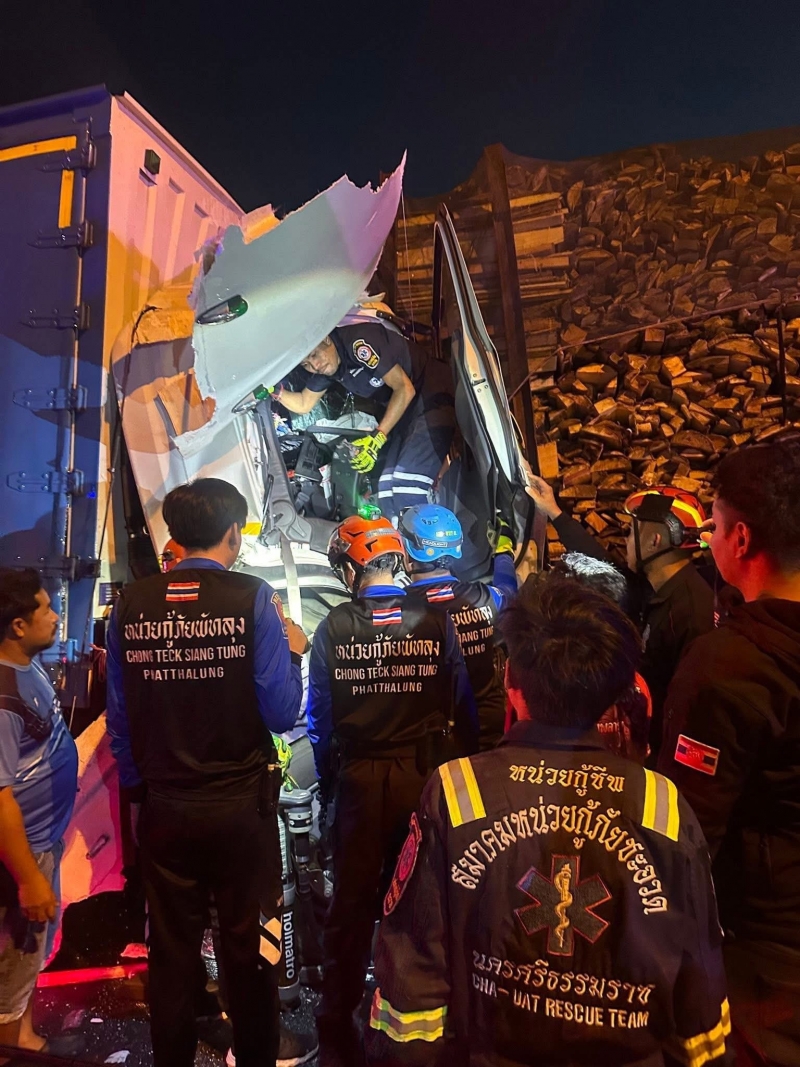 วันที่ 30 พฤศจิกายน 2568 เวลาประมาณ 05.50 น. บริเวณพื้นที่บ้านโคกกอ หมู่ 6 ตำบลป่าพะยอม อำเภอป่าพะยอม รถบรรทุก 10 ล้อ ทะเบียน 700-5612 กรุงเทพมหานคร พุ่งชนท้ายรถเทรลเลอร์ 22 ล้อ ทะเบียน 83-1282 นครศรีธรรมราช ซึ่งจอดริมถนน คนขับรถเทรลเลอร์เผยว่าจอดซื้อกาแฟและกำลังจะขึ้นรถ